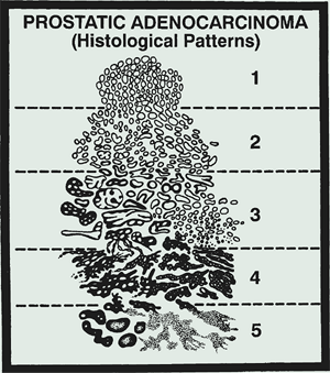 Clinical grading of prostate cancer is done with the Gleason grade and score. The Gleason Grade is a grade assigned to prostate cancer specimens that reflects the microscopic degree of aggressiveness based on the degree of resemblance to normal prostatic tissue. The Gleason Grades are: