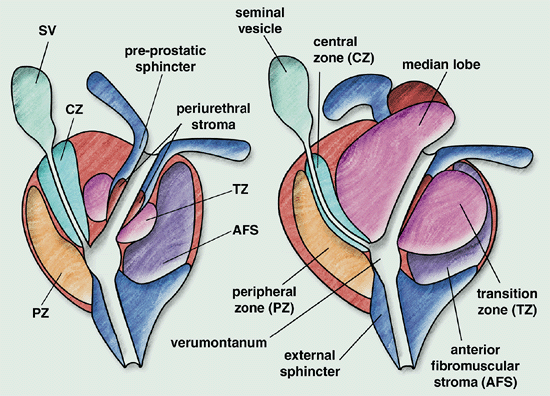 - Transition Zone (Benign prostatic hyperplasia develops in the TZ)