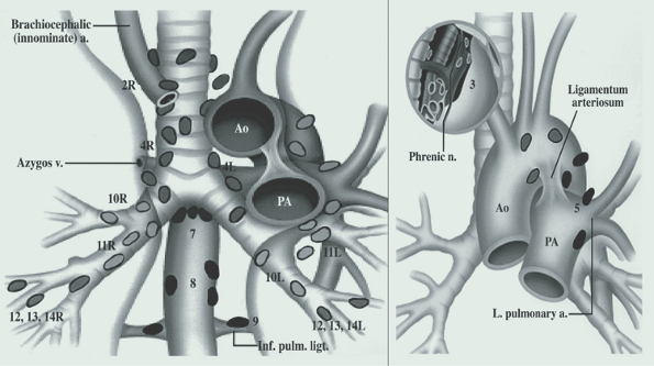 High mediastinal nodes Levels 1-4. Aortic Nodes are 5-6. Inferior Mediastinal nodes are 7-9.