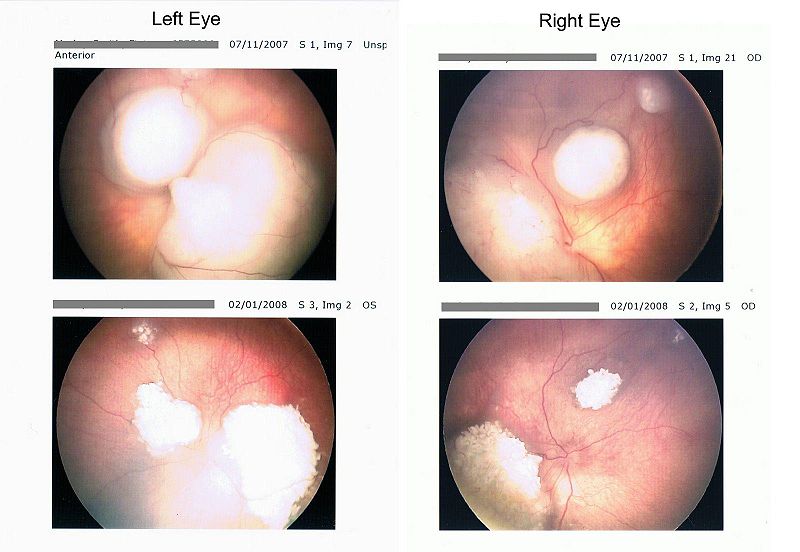 Retinoblastoma typically presents with a white pupillary reflex (leukocoria), which may be discovered in a photograph with an abnormal light reflex or with an opthalmoscope at a physical examination. Large retinoblastomas produce the white reflex when the flash bounces off of it or when the tumor produces retinal detachment.