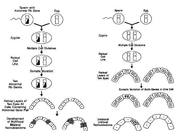 In the case of bilateral disease, the egg or sperm carries a mutant gene. Then the cell attains a second mutation. This cell then divides into retinal layers for both eyes.