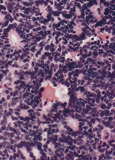 Retinoblastoma is of neuroepithelial origin, arising from the nucleated photoreceptor layers of the inner retina of one or both eyes. The disease consists of small round blue cells with scant cytoplasm and large nuclei. Calcification commonly occurs in necrotic areas. Pathologically Flexner-Weinersteiner Rosettes (neuroepithelial rosettes) are described microscopically. The Flexner-Weinersteiner Rosettes are an attempt to differentiate into photoreceptor cells.