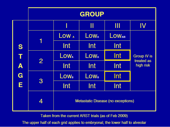 - Group II-III unfavorable site and Group IV (mets) Favorable/unfavorable histology: VAC+RT -- no benefit to adding adriamycin