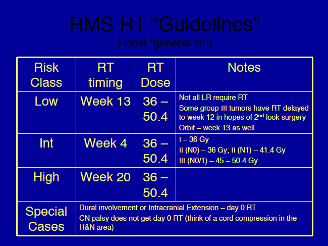 Secondary questions for IRS - VI include radiation dose: Is 36 Gy adequate for N0, R1 and is 45 Gy adequate for orbital RMS? A retrospective review by Mandell in 1990 (JCO) failed to demonstrate a difference between < 40 Gy and > 40 Gy in 32 Group II (R1) patients in local control at MSKCC.