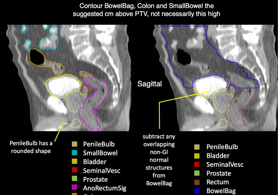 GTV is the entire prostate. If a urethrogram is used, the apex is designated at the visualized prostate or 5 mm superior to the tip of the urethrogram dye. The initial field encompasses the pelvic lymphatics from L4/L5, pre-sacral nodes from L5-S1 and inferiorly below the prostate by 5 mm. The internal and external iliac nodes should be covered below the SI joints. Lateral fields should include the posterior extension of the seminal vesicles. The usual posterior border is S2/S3, but this may vary based on CT imaging and imaging should take precedence. The inferior extent of the internal iliacs are the tops of the femoral heads, the inferior extent of the obturator nodes is the top of the pubic symphysis.
