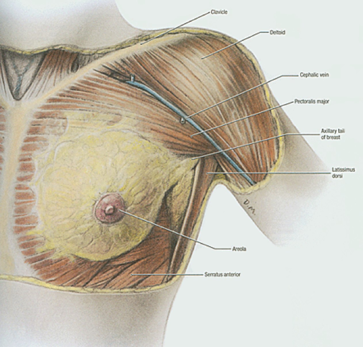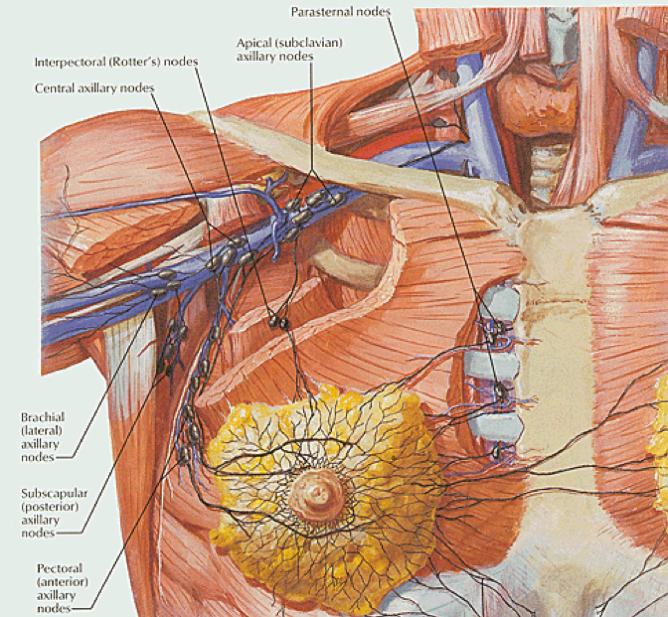 Breast anatomy has been discussed in the Early Breast Cancer section. The additional information here describes the nodal drainages and important surgical landmarks of breast anatomy. Please see Early Breast Cancer for more information.