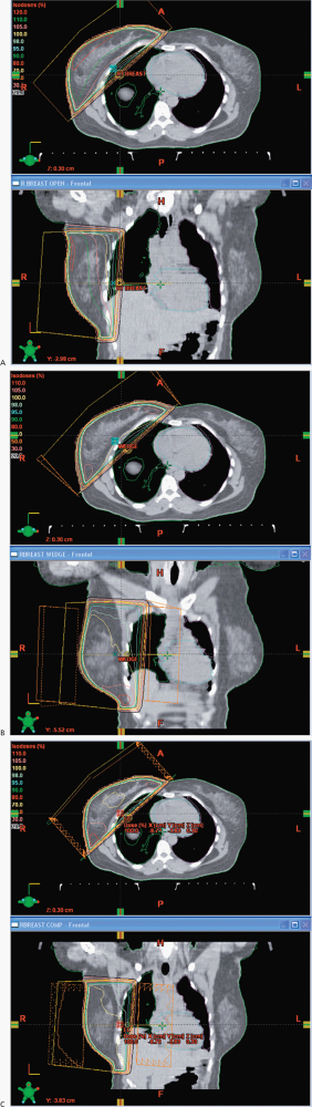 In this case, I would propose a boost of 10 Gy for a total dose of 60 Gy. The primary fields for the whole breast are opposed tangents with the patient on a breast board to obtain good geometry for breast coverage with the arms over the head in a supine position. We use a vac-loc to immobilize the head, arms and upper torso on the breast board with the board elevated to bring the mid sternum parallel to the couch and posterior collimator. We try to avoid, if possible collimator rotations to minimize beam divergence, and half beam block the deep portion of the tangent. The breast is outlined with wires placed at the superior, medial, inferior and lateral borders. The anatomic landmarks include the inferior margin of the head of the clavicle, mid sternum, 2 cm below the inframammary fold and the mid-axilla line. As all chest/breast setups are clinical, we do a control scan in the mid-region of the breast to identify the positioning and verify correctness of the lateral wire, which often requires some adjustment. This will minimize the setup uncertainty. The images are then sent to the treatment planning system for block design, with blocks placed to insure coverage of the breast tissue while minimizing the dose to the lung, heart, contralateral breast, and accounting for breathing motions. Some centers use deep inspiration breath hold technique, but this requires a fast scanner and rapid treatment administration. The boost field is generally given with electrons and if electrons are not suitable due to depth then a reduced opposed tangent field is useful. We do not treat the axilla.