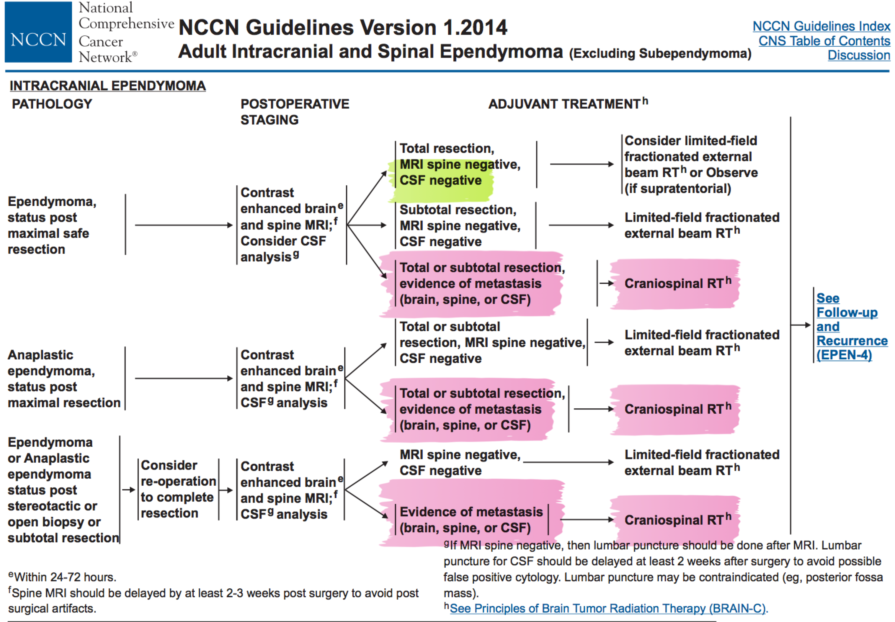 The initial work up should be an MRI with contrast or alternatively a Contrast Enhanced high resolution CT of the brain. Once imaging is obtained then a decision can be made concerning the extent of surgery. Ideally, the surgery should be a gross total resection. If this is feasible, then proceed to surgery for gross total resection. Otherwise, a sub-total resection or stereotactic biopsy will obtain tissue for definitive diagnosis. A postoperative contrast enhanced MRI of the brain should be obtained within 72 hours of surgery (POD 1), the spine MRI should be delayed by 3 weeks to insure there are no surgical artifacts. CSF fluid must be analyzed in the case of anaplastic ependymoma (Grade IV), otherwise it should be considered. If the MRI of the spine is negative, then proceed to LP. The LP should be delayed at least 2 weeks to avoid false positive associated with surgery and, in the case of a posterior fossa mass, an LP should be avoided.