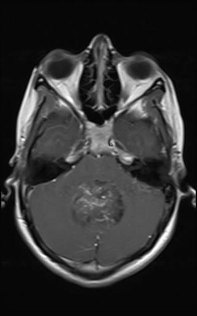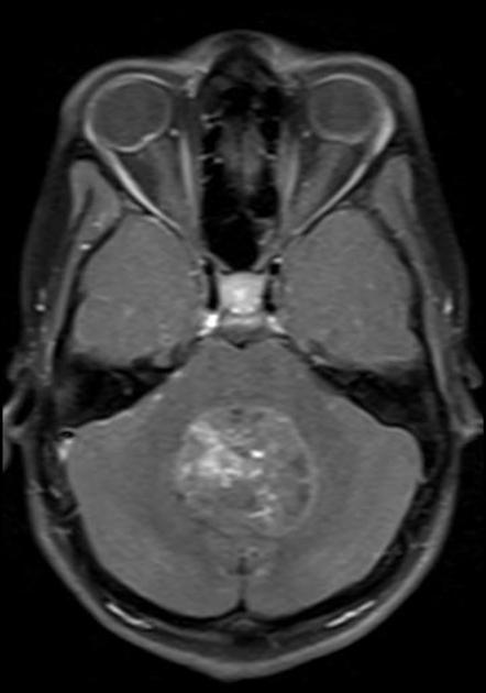 These tumors are more common in adults. Radiation fields for non-metastatic disease are now local, limited involved fields. As discussed above, special attention should be paid to the prospect of 4th ventricle tumors spreading into the upper cervical spine. About 10%-30% spread throught he foramen magnum. The general radiation target volume for localized intracranial disease is the GTV+resection cavity + 1.5 cm, with larger margins when diffuse infiltration is suspected.