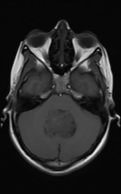 Imaging is the usual initial workup followed by surgery or biopsy for tissue diagnosis. Surgery alone may be adequate in selected patients based on the results of pediatric series. The usual standard of care for adults is post-operative radiation. Post operative workup includes an MRI of the CNS axis with contrast, consider CSF analysis. If CNS imaging is not obtained before surgery, then a waiting period of about 3 weeks should be met before additional imaging to insure artifacts from surgery do not interfere with the study.