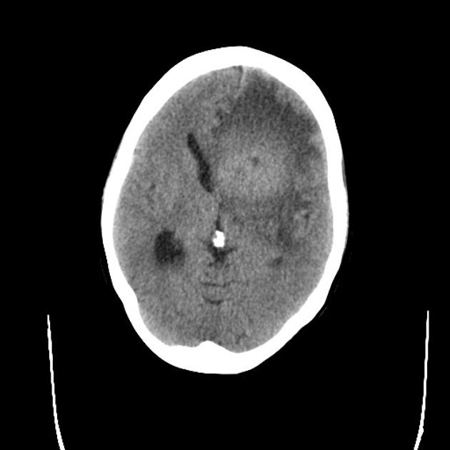 CT images are hypointense. Hemorrhage is uncommon. Multiple lesions are more common in HIV+ patients.