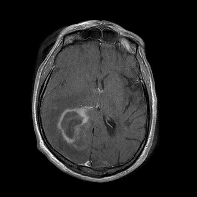 A detailed history and physical evaluation with particular attention to time course and nature of symptoms, followed by an MRI of the brain is the usual initial workup. The T1 MRI shows a hypointense or isointense lesion, and T2/FLAIR shows variable surrounding edema. T1/Gad shows homogenous enhancement without ring enhancement and lacking central necrosis. Ring enhancement occurs more often in immunocompromised patients.