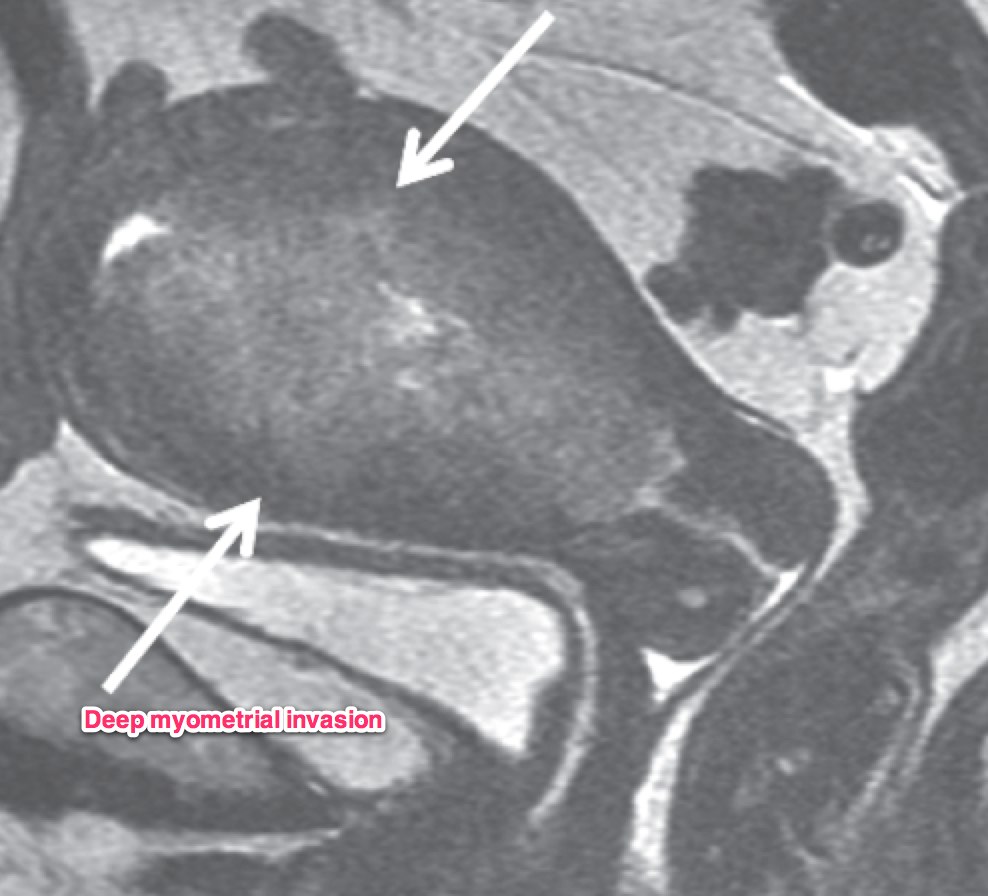 Dynamic contrast enhanced MRI is optimal for MRI studies with accuracy of 85% or better. If there is a clear junctional zone between the tumor and the myometrium, the disease is most likely limited to the myometrium. MRI can also determine depth of cervical stromal invasion.