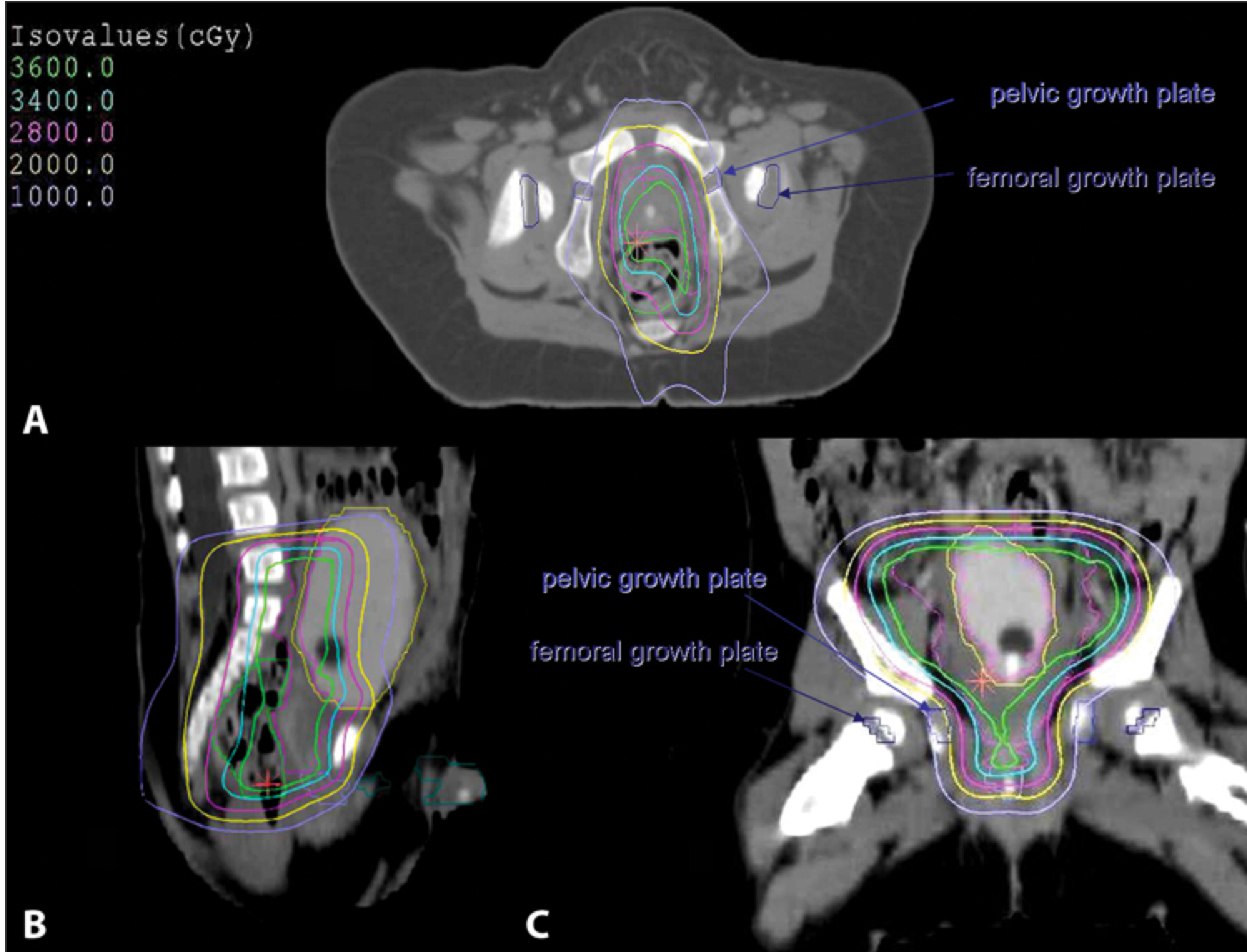 3D conformal treatment planning is essential. CT (for boney anatomy and growth plate identification) fused with MRI (for soft tissue identification) provides the best imaging technique. For patients with large tumors displacing bowel GTV is defined as the preoperative tumor volume excluding the debulked portion while accounting for shifting structures.