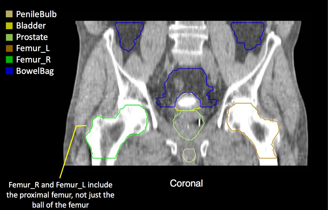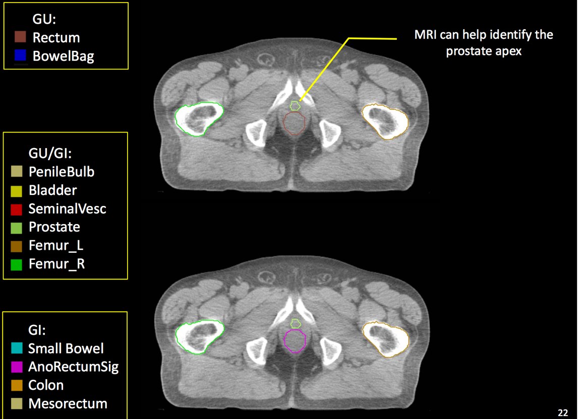 GTV is the entire prostate. If a urethrogram is used, the apex is designated at the visualized prostate or 5 mm superior to the tip of the urethrogram dye. The initial field encompasses the pelvic lymphatics from L4/L5, pre-sacral nodes from L5-S1 and inferiorly below the prostate by 5 mm. The internal and external iliac nodes should be covered below the SI joints. Lateral fields should include the posterior extension of the seminal vesicles. The usual posterior border is S2/S3, but this may vary based on CT imaging and imaging should take precedence. The inferior extent of the internal iliacs are the tops of the femoral heads, the inferior extent of the obturator nodes is the top of the pubic symphysis.