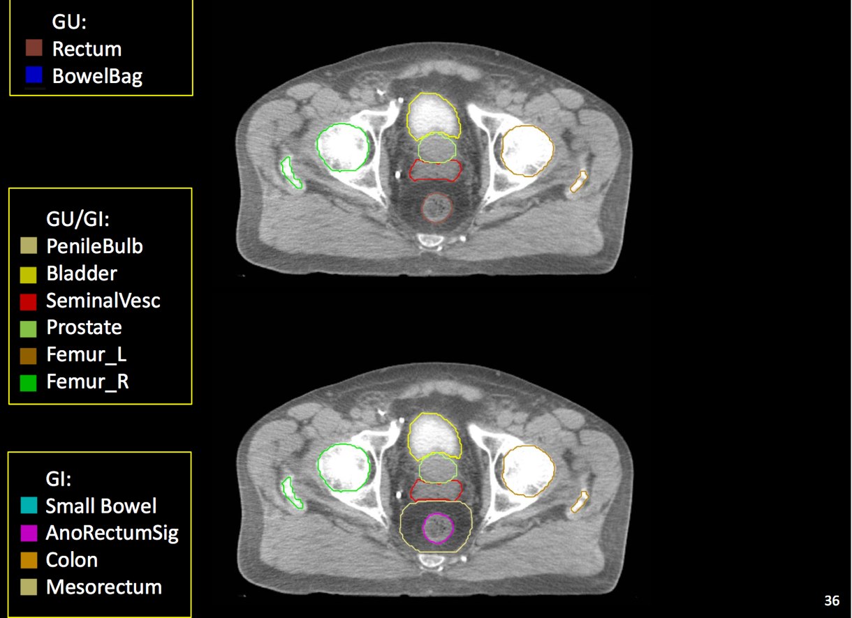IMRT planning uses inverse planning to deliver conformal dose to target while avoiding organs at risk. Careful delineation of OARs is important. Recently, advanced use of knowledge of radiobiologic dose-volume toxicity data (pre-Quantec and Quantec) has become more important in limiting toxicity while insuring adequate dose to the target volume. These data are used to identify treatment volume constraints. The constraints vary by organ and volume of tissue treated. (See Quantec Pelvis discussion)